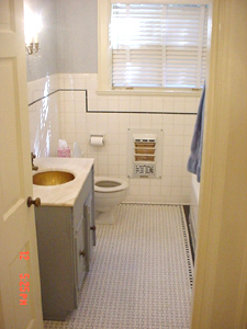 This beautiful bath has white one inch mosaic floor tiles with black accents.